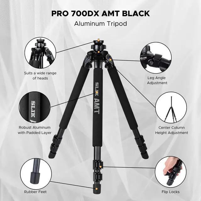 Using a "Tri-Titanium" alloy compromised of aluminum, magnesium, and titanium, the Slik 700DX Pro Tripod Legs has a strength-to-weight ratio 40% greater than comparable tripods in its class. It is a very professional unit whether you're concerned with strength, fit and finish, or refinement of operation. The rapid-type center column cannot rotate accidentally, and the lever locks work securely with a minimum of movement. The 700DX has foam-padded upper segments to ease carrying on your shoulder and working in the cold, and its simple angled rubber feet give a firm footing on a wide variety of surfaces.