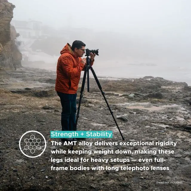A professional's leg set with 30.2 mm maximum diameter upper segments Dual alignment grooves on all leg segments eliminate leg twist and increase strength Individual 3-position leg angle locks for low angle work or use on uneven terrain Rubber feet for maximum traction on a variety of surfaces Working height of 70.1" puts camera's viewfinder at or above eye level for most users Two-part center column allows lower minimum operating height
