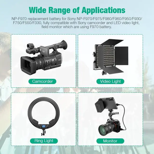 • Wide Compatibility: Fully compatible with the Sony DCR-VX2100, DSR-PD150, DSR-PD170, FDR-AX1, HDR-AX2000, HDR-FX1, HDR-FX7, HDR-FX1000, HVL-LBPB, HVR-HD1000U, HVR-V1U, HVR-Z1P, HVR-Z1U, HXR-MC2000U, MVC-FDR1, NEX-EA50UH, NEX-FS100U, NEX-FS700U handycam camcorder, led video light and field monitor which are using F970/F750/F550 battery