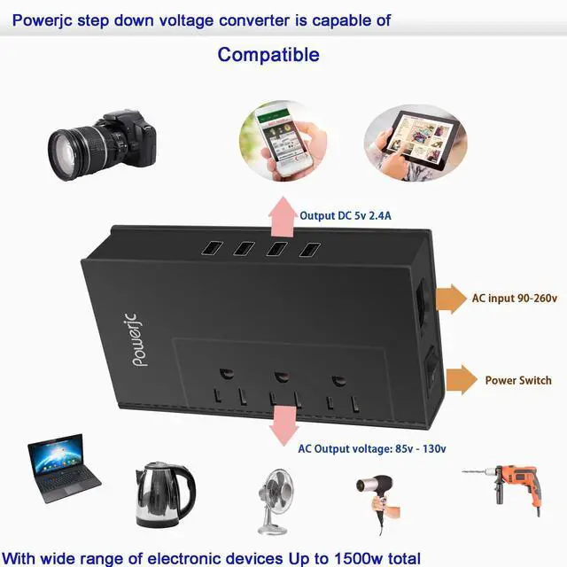 ^^ Product Features: Powerful step-down voltage converter 220v to 110v, AC output power 1500 watts, output voltage stable at 100V-130V, it can effectively drive high power appliances such as hair dryer, electric kettle, coffee machine, cell phone, tablet PC, electric drill and other electric tools. ^^ Safety protection function Surge protection, overheat protection, overcurrent protection, overvoltage protection, output short circuit protection, and overload protection are included in the calculation. The built-in automatic shutdown protection function can effectively provide safety protection when the equipment is abnormal. The product is ROHS, FCC, CE and ETL certified. ^^ Suitable for global use Equipped with 5 types of power adapters (Type-I, Type-A, Type-C, Type-D, Type-G, Type-L), it is suitable for use in Europe, Asia, Russia, UK, Ireland, France, Germany, Italy, Brazil, Norway and most other countries and regions. And it is compatible with power outlets. ^^ Package Contents 1) 1x Powerjc step-down voltage converter. 2) 1x power cord. 3) 5x additional international adapters. 4) 1x cloth tape.