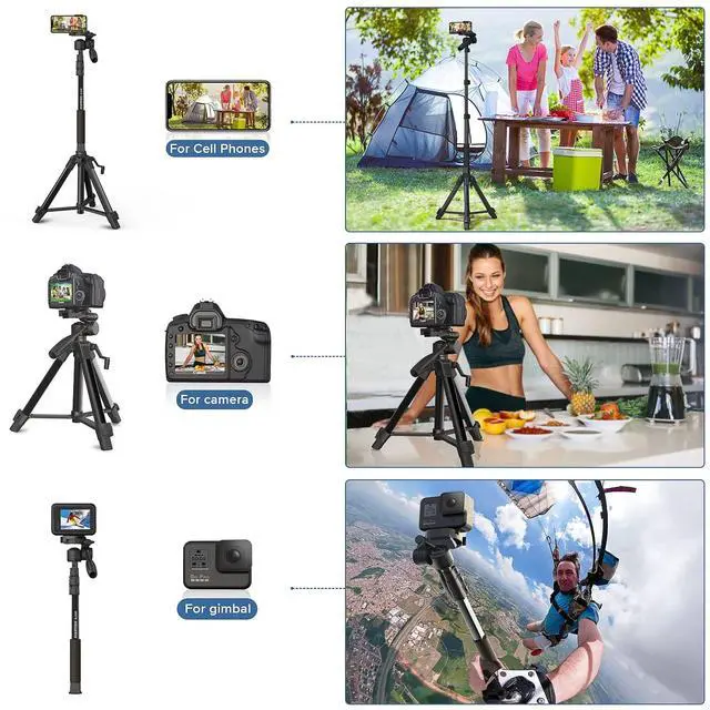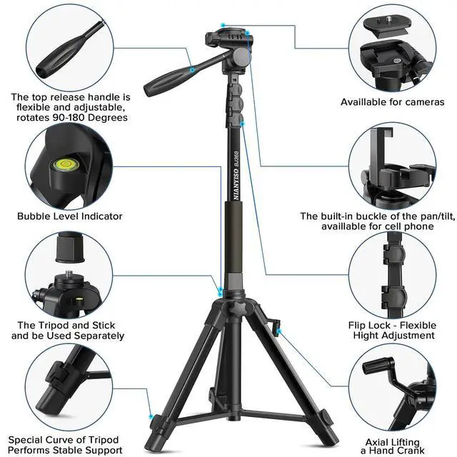 Multifunctional Three-way Pan/Tilt 360rotating, adjustable-angle pan/tilt allows you to take panoramic photos/videos at will. Camera tripod has a 360 rotation function, allowing tilt and rotation movements; portrait or landscape options. NIANYISO Tripod has an exclusive patent and is equipped with a quick release plate, It can convert a camera tripod to a phone tripod without installing anything. Simply pull out the built-in buckle of the pan/tilt, it can be used as phone tripod ^^ SOME SUGGESTIONS I HAVE TO SAYFor your experience, it is not recommended to use this camera stand with a heavy camcorder or camera when it is fully extended.