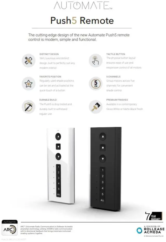 RollEase Acmeda Automate Paradigm Push 5 Hand Held Remote Control for Roller Shades - #MT02-0101-067004