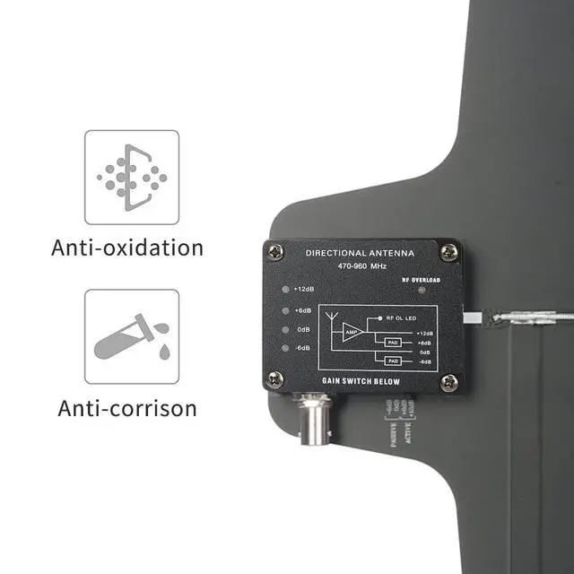 Active Directional antenna technology index: Antenna Type Log periodic dipole array antenna RF Frequency band 470-960MHz Working voltage 10V DC Impedence 50 Connector Type BNC Antenna Gain 7.5 dBi Antenna Distribution System Technology Index Carrier Wave frequency band 470-960MHz Input/output antenna connector type BNC Impedence 50 Output external power supply DC 12V 800mA