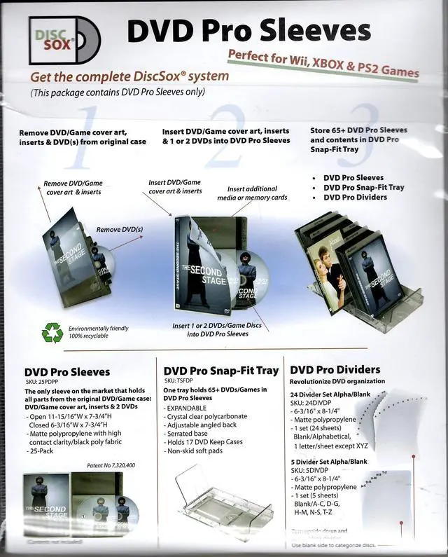 DiscSox DVD Pro Sleeves, made entirely from environmentally friendly polypropylene. Matte poly with high contact-clarity is used for storing the graphics, providing excellent visibility. Black poly fabric fully protects the discs and prevents scratching. Special ergonomic design of the sleeve allows for easy insertion of the DVDs, DVD wrap and movie poster Holds Warner Brothers cardboard style DVD packaging Unit Dimensions - 11-15/16 W x 7-3/4 H (Open), 6-3/16 W x 7-3/4 H (Closed)