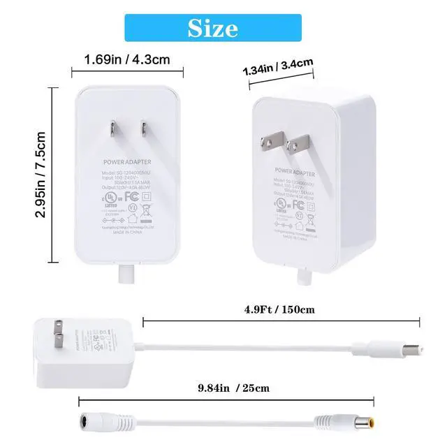 input: AC 100-240V, output: DC 12V 4A; AC wall us plug compatible CA, JP, MX country. DC barrel plug connector, charging