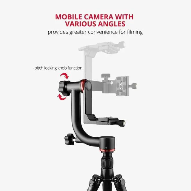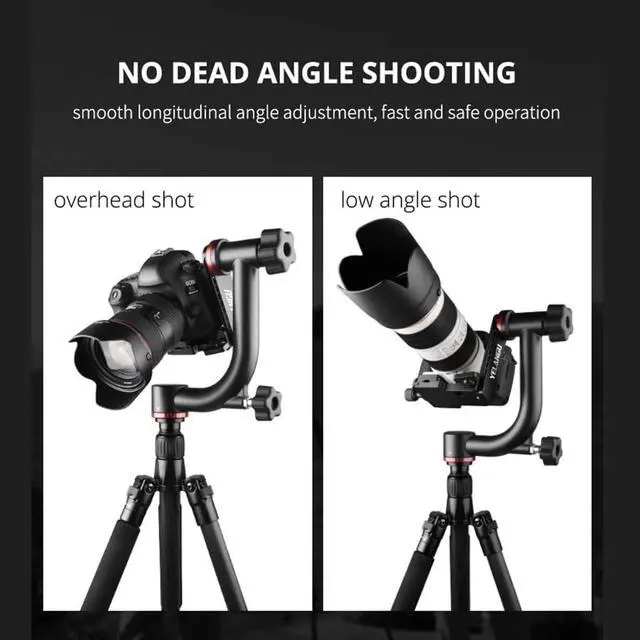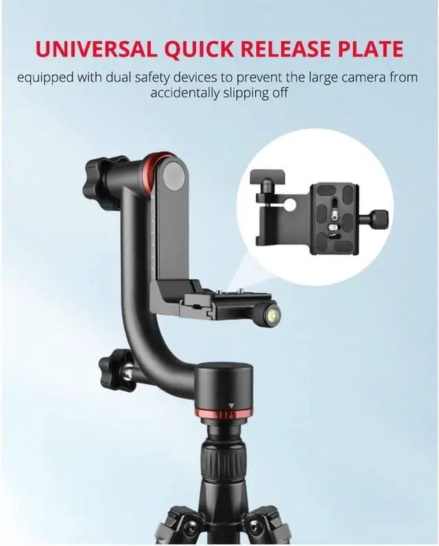 Note: camera and tripod are not included; for camera with telephoto zoom lens, you need to buy a tripod mount ring separately for it to work properly and for better balance ^^ With Bearing StructureThe Gimbal Tripod Head balances the camera on vertical and horizontal axes and allows you to swivel and rotate your camera with high accuracy. Built with bearing structure, it is more smooth and much easier to adjust. Ideal for bird watching and photographers who want to capture sharp pictures of fast-moving subjects in wildlife and sports photography ^^ 360 Panning BaseThe panning base with panoramic scales let you precisely rotate your camera at 360 for panoramic shots. A lock knob helps you fix the panning base in place. the swinging arm enables you to photograph vertically and horizontally. The scale on it allows you to place the quick release plate platform at different heights ^^ Quick Release PlateThe gimbal head can fit all tripods thanks to the included 1/4" to 3/8" screw, the quick release plate connects a wide variety of DSLR cameras, mirror less cameras, and camcorders through the 1/4" to 3/8" screw. The rubber-padded mounting plate protects your device from scratches.