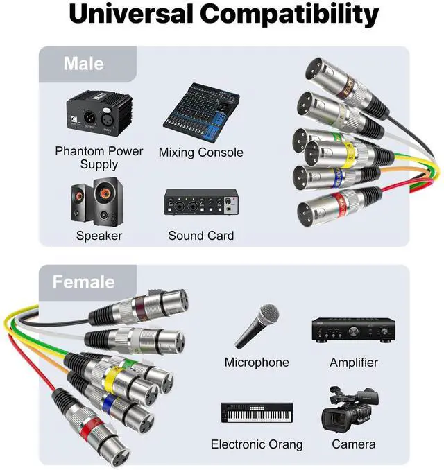 ANTI-INTERFERENCE DESIGN - This XLR Cable Snake uses 24AWG Oxygen-Free Copper and multiple shielding designs (anti-tensile cotton rope, aluminum foil layer, polyethylene insulation), maximizing external interference resistance and providing maximum conductivity and signal clarity. With a soft & durable PVC jacket easy to clean ^^ NEWLY UPGRADED 6-CHANNEL DESIGN - The Snake cable is specially designed for 6 channels. The XLR snake can transmit balanced audio signals from 6 to 6 other devices. One cable equals the work of 6 cables. It is easy to carry and store and can easily solve the trouble of winding multiple single-channel cables ^^ COLORED 3-PIN SNAKE CABLES - The 6-Channel XLR Snake is designed in 6 different colors (red, orange, yellow, green, white and brown) to help you easily trace microphones, mixing boards and other connectors.