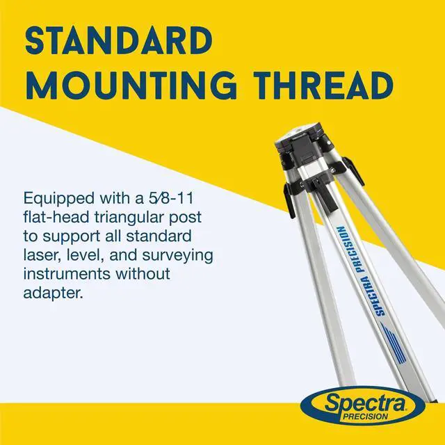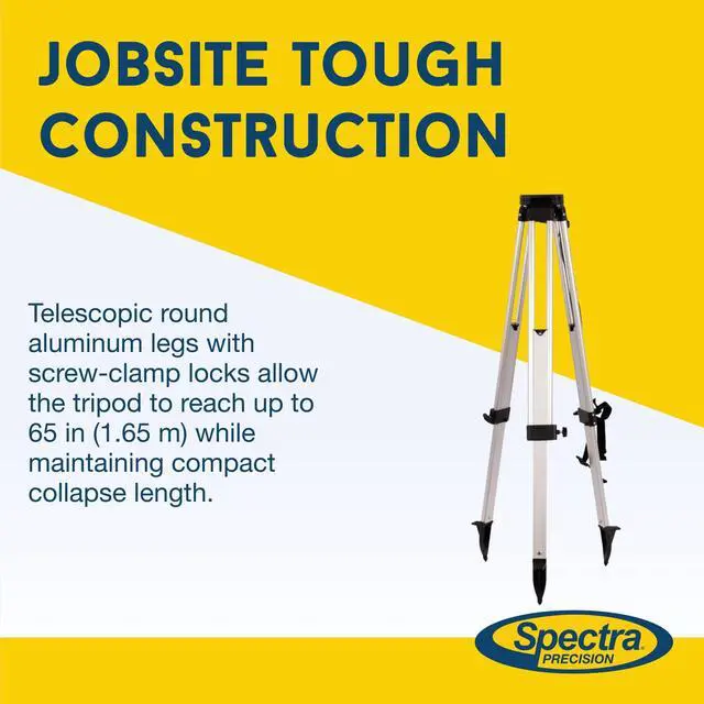The Spectra Aluminum Tripod with Round Legs accommodates 5/8 x 11 instruments and is designed for all types of jobs. With a telescopic aluminum round legs which allow easy setup, this tripod extends up to 65 inches. Plus, the Spectra tripod features a screw clamp lock type with a triangular flat head that securely holds the instrument. Comes with a black finish coating, this tripod only weighs 9.35 pounds ideal for all surveying applications.