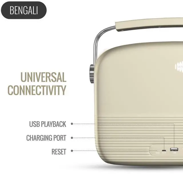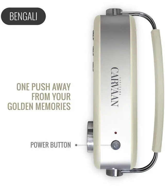 Each music station can be selected by turning a jog-dial. So literally, with the turn of a knob, you can switch from Hemanta Mukherjee hits to poetry and songs by Kazi Nazrul, to retro Hindi by Kishore Kumar, to Tagore songs all in their original versions, back-to- back without any ads. What's more, Saregama Carvaan Bengali has dedicated stations for Tagore songs covering his collections like Prem, Puja, Prakriti and Bichitro. With its premium retro look, extensive content library and ease-of- use, Saregama Carvaan Bengali becomes the perfect gift for you and your loved ones.