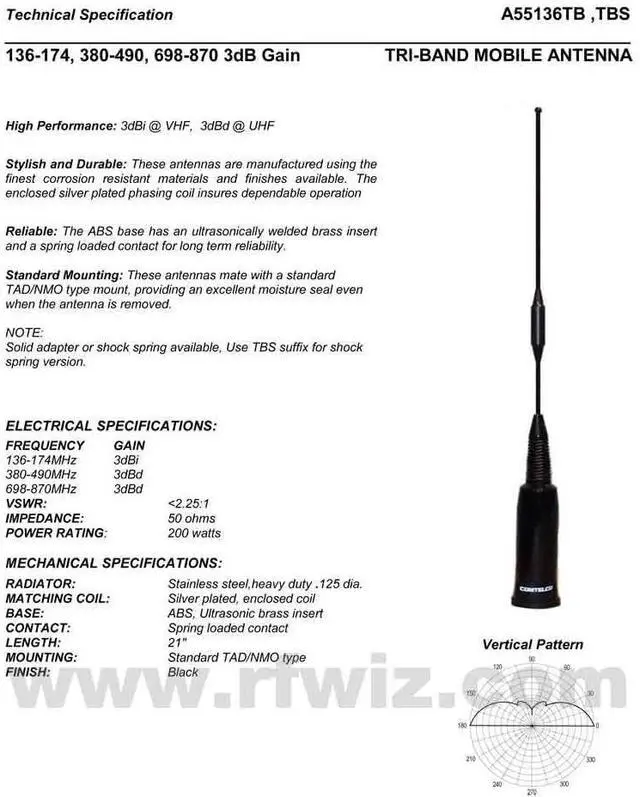 • 136-174 MHz, 3 dBi gain (VHF)
