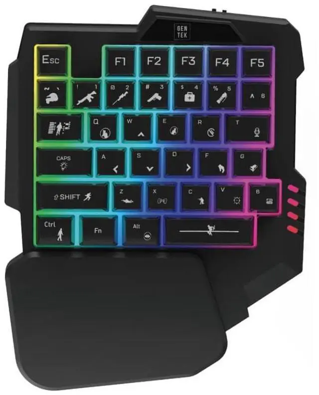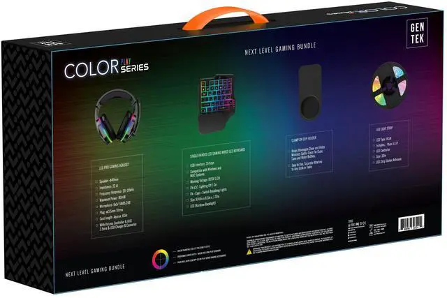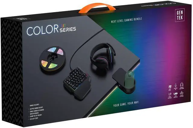 RGB LED Pro Gaming Headset Features changing lights, soft ear cushions, 60-inch 3.5 mm cord with volume control, and USB power ^^ One-Handed RGB Gaming Keyboard Compact and responsive 35-key layout with ergonomic curved keys, compatible with both Windows and Mac ^^ 36-Inch RGB LED Adhesive Light Strip Add customizable ambiance to your setup with color-changing LEDs and an easy-to-use controller ^^ Clamp-On Desk Cup Holder Keep your drinks within reach and your desk clutter-free; fits cans, water bottles, and more