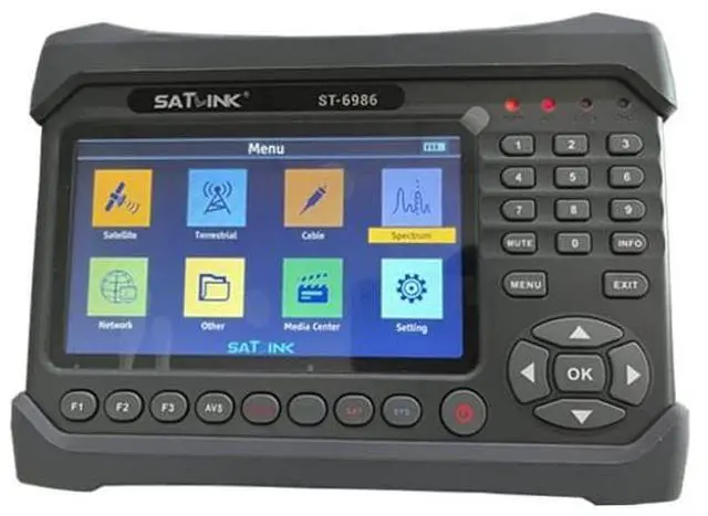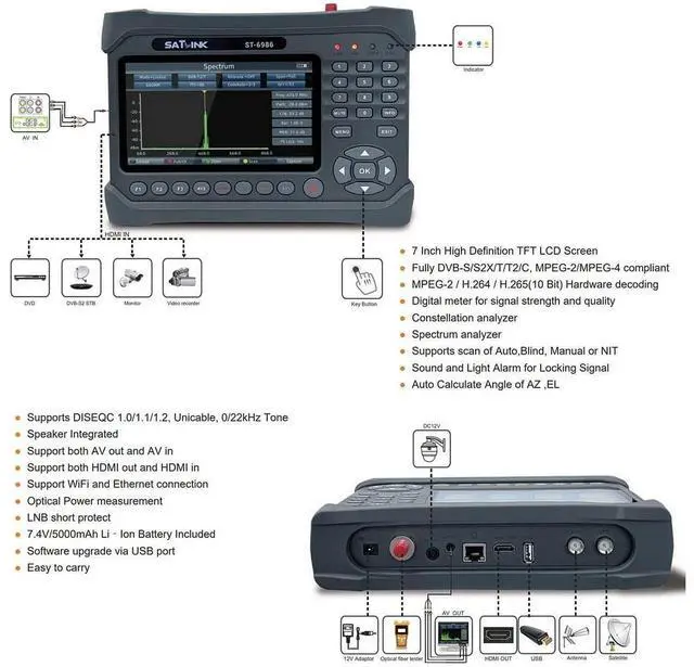 Feature 7 Inch High Definition TFT LCD Screen (1024*600) Fully DVB-S/S2/S2X, T/T2/C, MPEG-2/MPEG-4 compliant MPEG-2 / H. 264/H. 265 (10 Bit) Hardware decoding Supports Constellation analyzer Supports Spectrum analyzer Supports scan of Auto Blind, Manual, NIT Supports and Light Alarm for Locking Signal Auto Calculate Angle of AZ, EL Supports DISEQC 1.0 / 1.1 / 1.2, Unicable, 0/22khz Tone Speaker Integrated Supports both AV out and AV in Supports HDMI IN/OUT out and AV in Supports Wi-Fi and Ethemet connection Optical power measurement LNB short protect 7.4V /5000mAh Li-ion Battery included Software upgrade via USB port Easy to carry