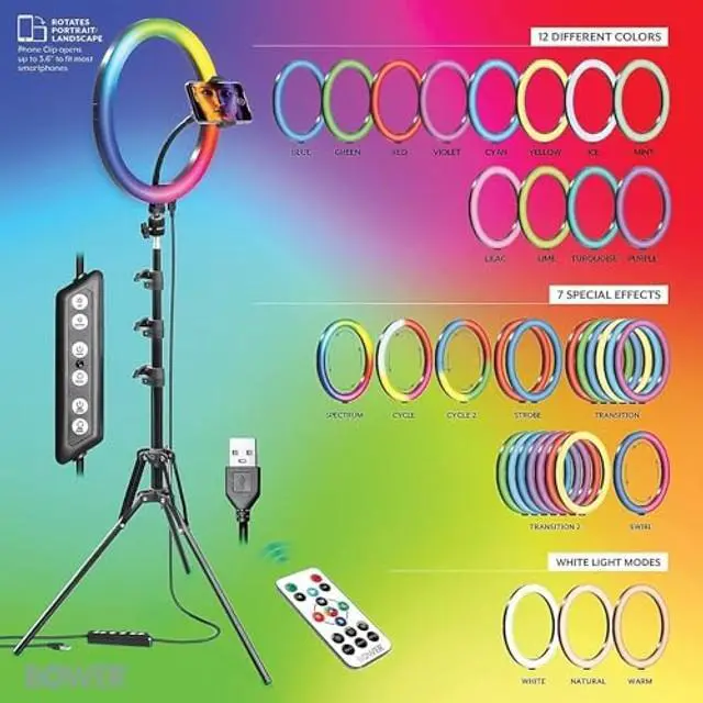 RGB LED Ring Light: Illuminate your content with 9 dynamic RGB colors, 3 white light modes, and 7 special effects for dramatic visual aesthetics.
