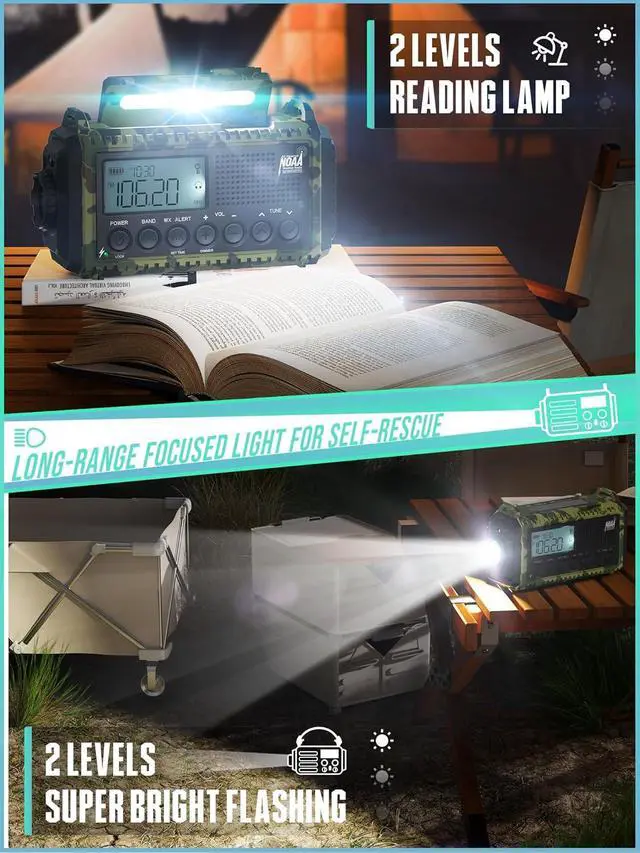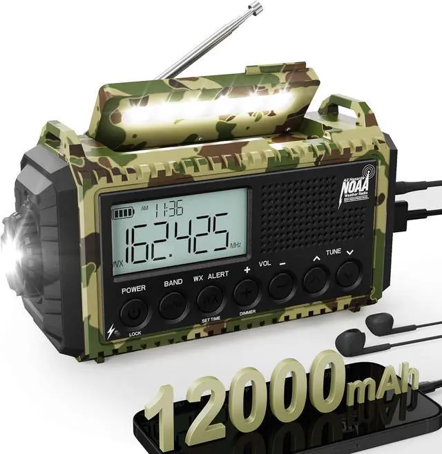Longest-Lasting Survival Radio - This weather radio has a built-in 12000mAh rechargeable battery, providing several days of continuous use on a single charge. Perfect for extended outdoor activities or power outages, it ensures reliable NOAA/AM/FM emergency weather updates. The emergency radio features a super-bright flashlight and a reading lamp, a loud 116dB SOS alarm, a hand-crank, and a solar panel for battery charging.