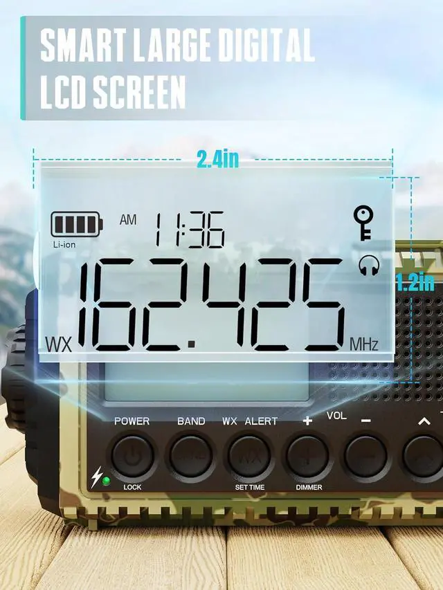 Bright Flashlight & Reading Lamp + Large HD LCD Screen - The solar radio includes ultra-bright 3W flashlight and reading light, illuminating up to 230 feet or a 20 area. Enjoy 50-70 hours of continuous light. The advanced LCD display with backlight shows time, battery level, and alerts, with a power-saving mode that turns off the backlight after 15 seconds of inactivity.