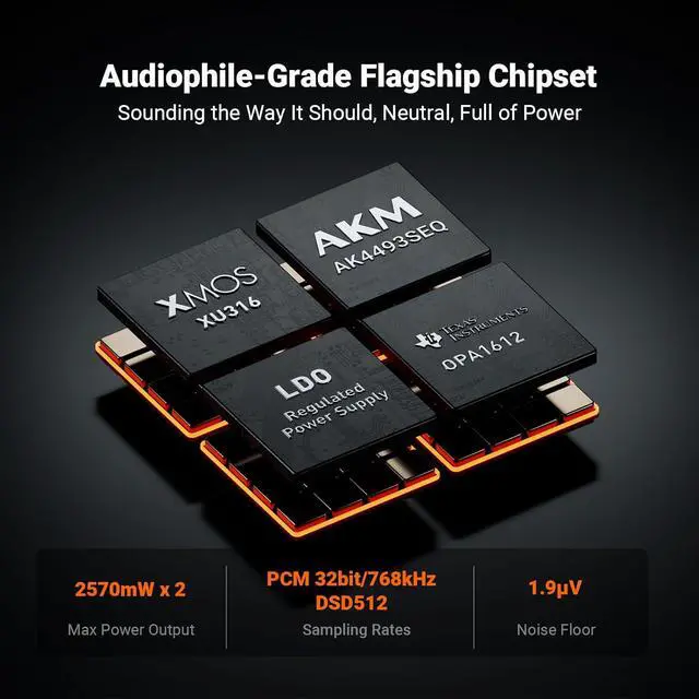Exceptional Sound Quality: Premium chipset with AKM4493SEQ DAC, XMOS XU316 processor, and four OPA1612 amps supports up to PCM 768kHz/32bit & DSD512. A self-developed dual-power balanced amp circuit with multiple ultra-low-noise LDOs and capacitors keeps noise as low as 1.9V