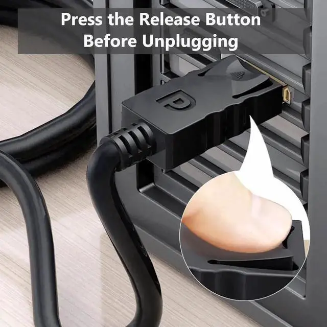 DisplayPort connector with latches provides a secure connection, the latches will improve the connection stability in usage. When plug out, please press the realse button, and easy to pull out.