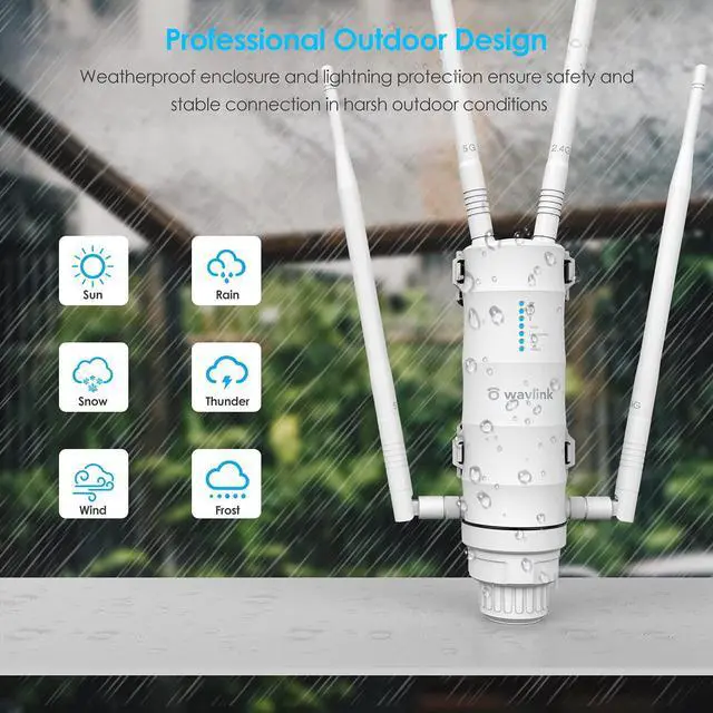 Long Range Outdoor Wifi ExtenderIP65-rated weatherproof & heat-resistant case that ensures continued operation on harsh outdoor environments or in climates of extreme cold, heat or continuous moisture, withstanding broad ranges of humidity and temperature (-30°C~70°C) (-22°F~158°F); 15KV ESD, 4KV lightning protection, ensure stable connection in harsh outdoor conditions.