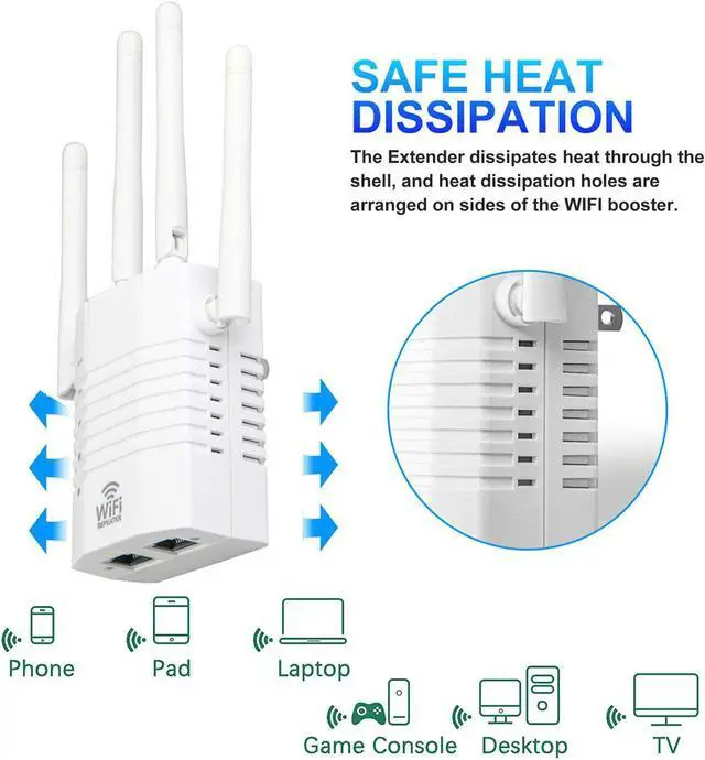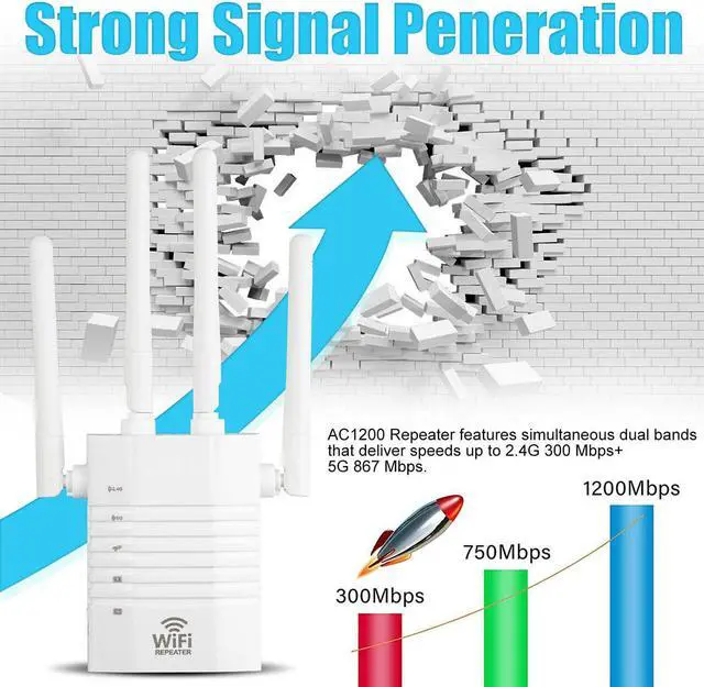 HIGH-SPEED STABLE SIGNAL]: Wifi Extender wireless signal booster with lastest dual band technology can provide up to 300Mbps for 2.4GH z, up to 867Mbps for 5Ghz, a total rate of about 1200Mbps, maximizing reduces the loss of data transmission and enjoying HD video/game and fast speeds internet mode.