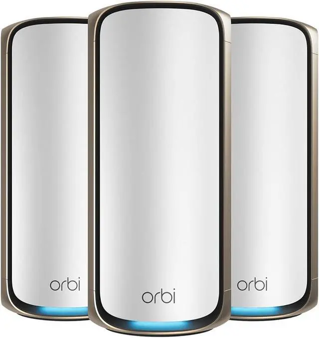 Orbi 970 Series Quad-Band Wifi 7 Mesh Network System (Rbe973S), Router + 2 Satellite Extenders, Covers Up To 10,000 Sq. Ft., 200 Devices, 10 Gig Internet Port, Be27000 802.11Be (Up To 27Gbps)