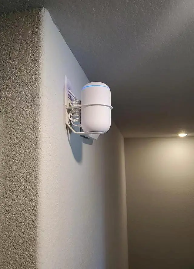 Easy to Install: First mark the three empty positions with a pencil where you want to place it, use an electric drill to make three holes, and then drive the drywall anchors into the wall. Place the UDM in the wall mount stand and fix it with screws.