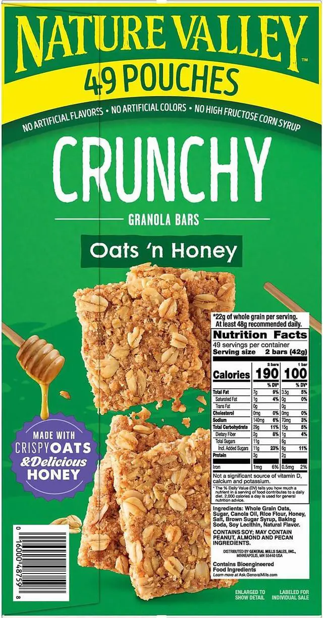 Savor the crunchy, sweet taste of these granola bars. Each of the 49 individually wrapped packages has two bars, so you can enjoy one immediately and save the other for later. These Nature Valley granola bars have 15 grams of whole grains per serving for a treat with ample nutrition.