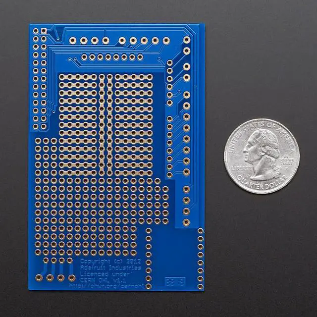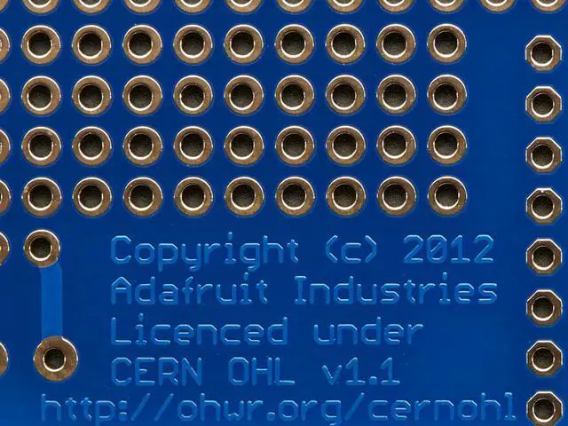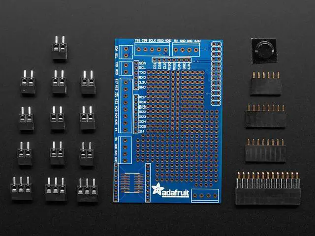 The basic essentials are all here. There's a big prototyping area, half of which is 'breadboard' style and half of which is 'perfboard' style so you can wire up DIP chips, sensors, and the like. Along the edges of the proto area, all the GPIO/I2C/SPI and power pins are broken out to 0.1" stips so you can easily connect to them. On the edges of the prototyping area, (almost all of) the breakout pins are also connected to labeled 3.5 mm screw-terminal blocks. This makes it easy to semi-permanently wire in sensors, LEDs, etc. There's also a 4-block terminal block broken out to 0.1" pads for general non-GPIO wiring. Finally, we had a little space remaining over the metal connectors so we put in an SOIC surface mount chip breakout area, for those chips that dont come in DIP format.