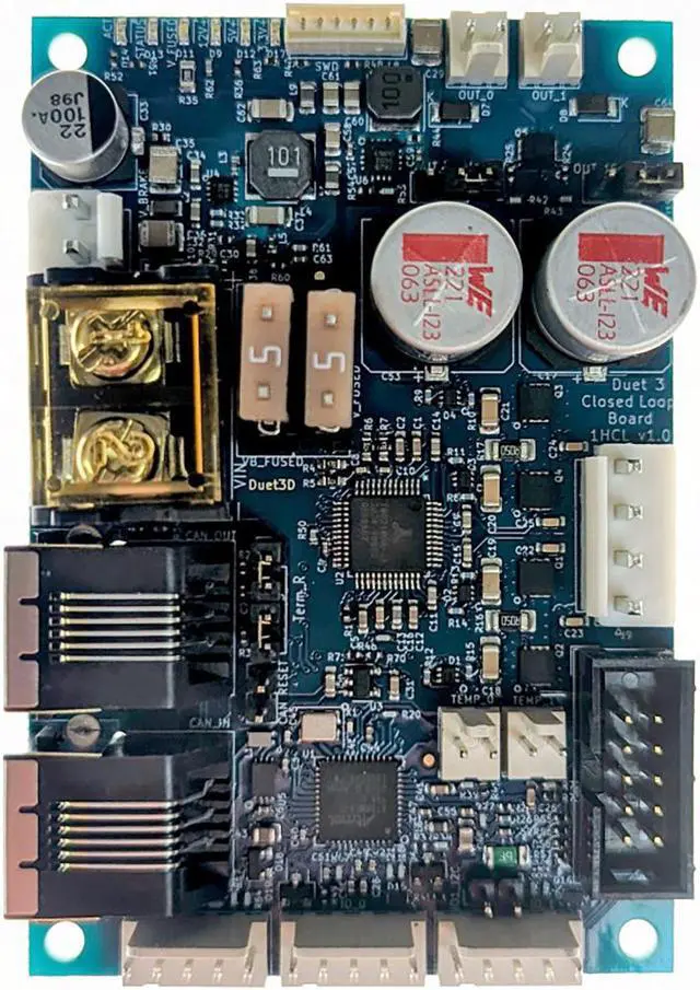 The Duet 3 Expansion 1HCL is a CAN-FD connected expansion board that is designed to provide a high current stepper motor driver, combined with multiple interfaces for position feedback. It has a number of peripheral inputs and outputs for functions such as sensing motor temperature, controlling a brake and axis endstop. It connects to the Duet 3 CAN-FD bus using RJ11 connectors (the same as the Duet 3 Mainboard 6HC, Duet 3 expansion boards, and the tool distribution board). Multiple 1HCL boards can be daisy chained on the bus, with power (up to 48V) provided locally. This allows for very large machines to be constructed without a significant wiring burden and signal integrity issues.