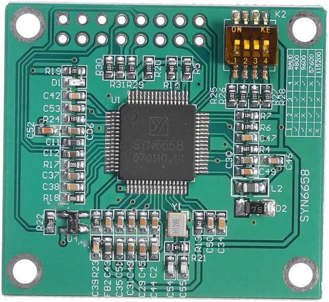 SYN6658 receives the text data to be synthesized through UART interface or SPI interface communication mode, and realizes the conversion of text to speech (or TTS speech). The module has a four-position DIP switch to select the baud rate, and has a power indicator. The size of the positioning hole and the position of the pin header are the same as those of the 5152 module.