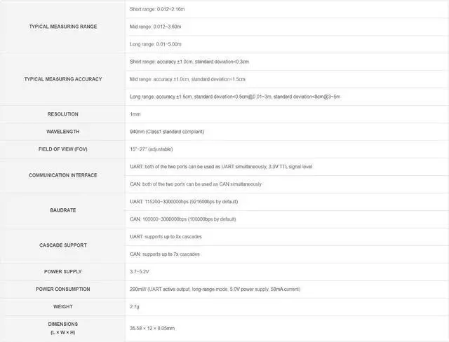 The TOF Laser Range Sensor is a TOF-based (time of flight) laser ranging sensor with embedded MCU and ranging algorithm, which is capable of offering up to 5m measuring range, ± 1.5 cm accuracy, and 1mm resolution. It supports cascade ranging via UART or CAN bus, configurable data output including active output and query output.