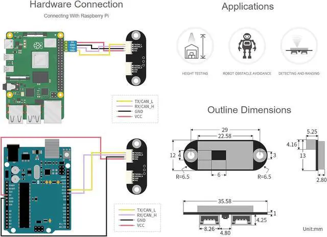 This sensor can be widely used in applications like common distance measuring, robot obstacle avoidance / route planning, as well as drone altitude setting / ceiling detection, and more..