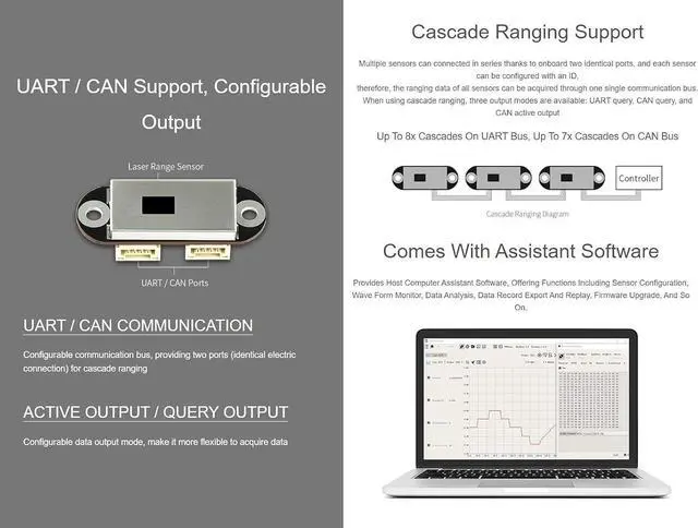 Multiple sensors can connected in series thanks to onboard two identical ports, and each sensor can be configured with an ID, therefore, the ranging data of all sensors can be acquired through one single communication bus.