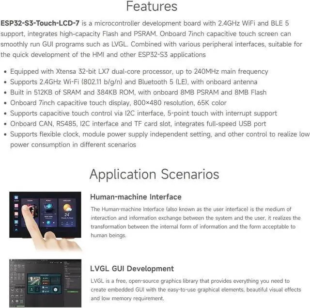 [Various Peripheral Interfaces] Combined with various peripheral interfaces, suitable for the quick development of the HMI and other ESP32-S3 applications. Supports flexible clock, module power supply independent setting, and other control to realize low power consumption in different scenarios