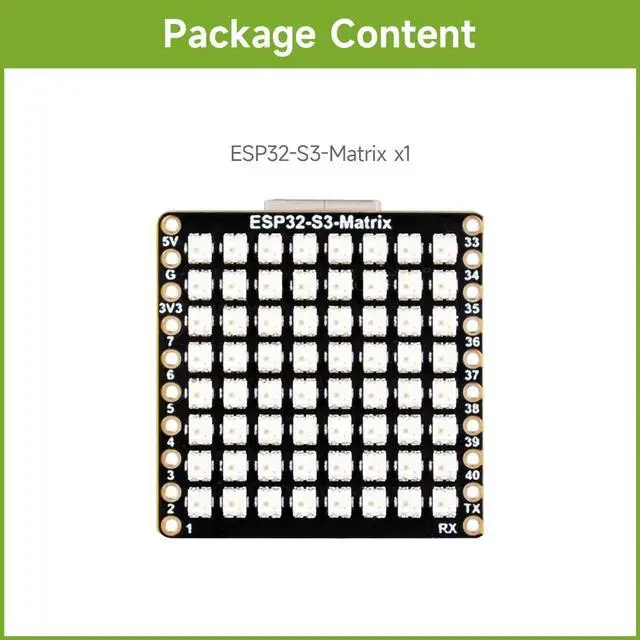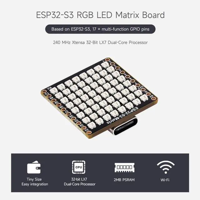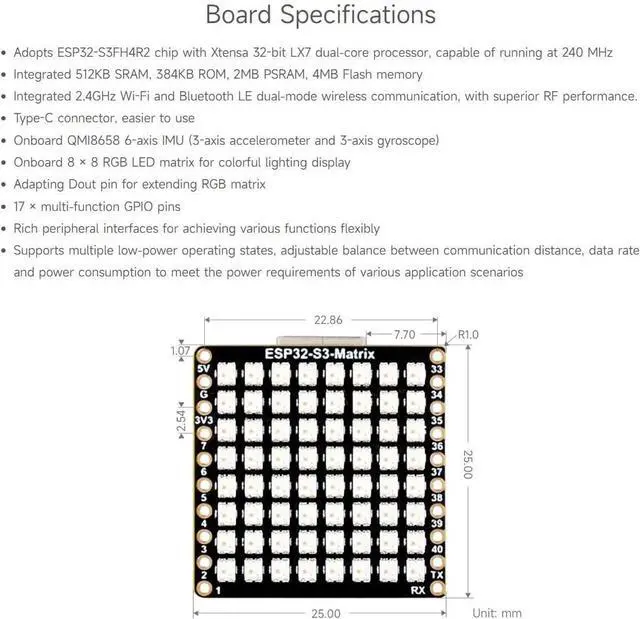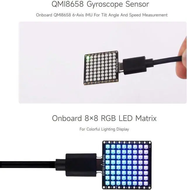 Type-C connector, easier to use. Onboard QMI8658C attitude sensor. Onboard 8 × 8 RGB LED matrix for colorful lighting display