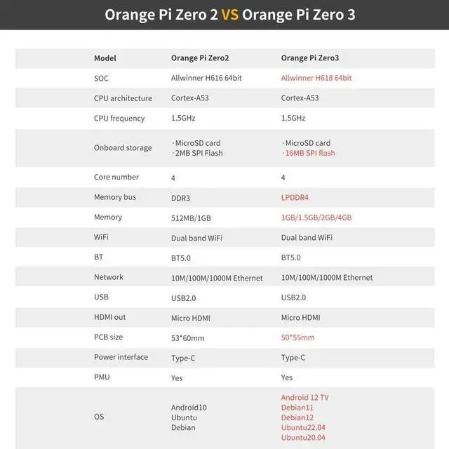 [Fully Upgraded Version]: Orange Pi Zero 3 provides an update to the Allwinner H616-powered Orange Pi Zero 2 quadrupling the maximum memory to 4GB and embedding a larger 16MB SPI flash. The Orange Pi Zero 3 is a compact Allwinner H618 quad-core Arm Cortex-A53 SBC with 1GB/1.5GB/2GB/4GB RAM, 16MB SPI flash, micro HDMI output, Gigabit Ethernet, WiFi 5 and Bluetooth 5.0, a USB 2.0 port, and 2 headers for expansion.