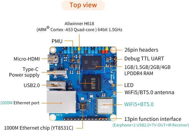 [Support Expansion Board]: Orange Pi Zero 3 development board can support earphone, 2*USB 2.0, TV out and infrared functions through conecting expansion board by 13 pin headers. In addition, the 26 pin headers on the board further enriches the function of the main board and improves the development greatly.