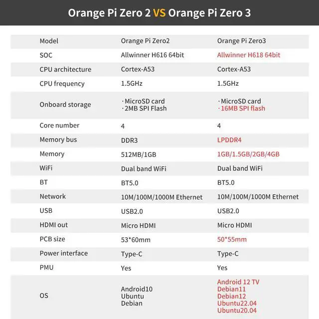 [Fully Upgraded Version]: Orange Pi Zero 3 provides an update to the Allwinner H616-powered Orange Pi Zero 2 quadrupling the maximum memory to 4GB and embedding a larger 16MB SPI flash. The Orange Pi Zero 3 is a compact Allwinner H618 quad-core Arm Cortex-A53 SBC with 1GB/1.5GB/2GB/4GB RAM, 16MB SPI flash, micro HDMI output, Gigabit Ethernet, WiFi 5 and Bluetooth 5.0, a USB 2.0 port, and 2 headers for expansion.