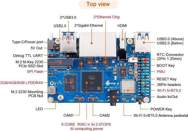 [High-Performance RISC-V Development Board]: Orange Pi RV2 features an octa-core RISC-V processor with integrated AI acceleration. It delivers 2.0 TOPS AI performance, with single-core CPU performance surpassing ARM A55 by over 30%.