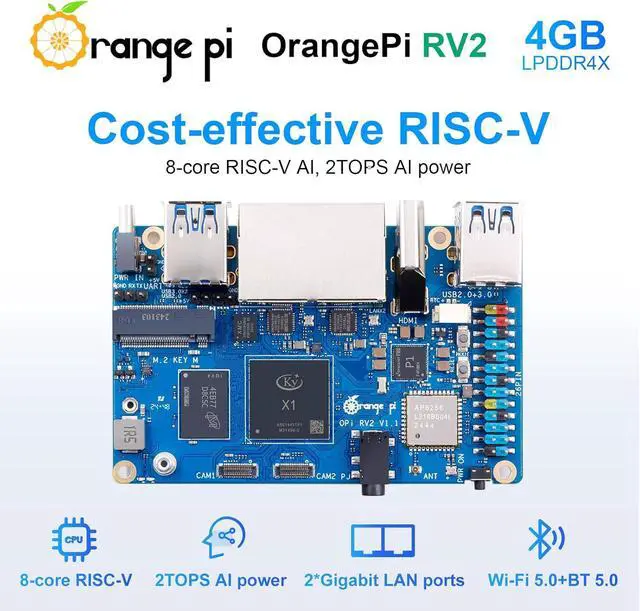 Orange Pi RV2 2GB/4GB/8GB LPDDR4x RISC-V Single Board Computer with 8-Core 64-Bit Processor, Wi-Fi 5.0/Bluetooth 5.0, Development Board Run Linux/Ubuntu/OpenHarmony (4GB)