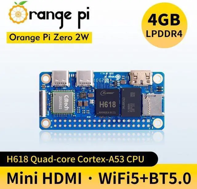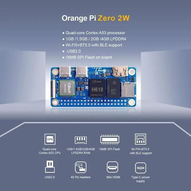 [Incredibly Powerful]: Orange Pi Zero 2W is a powered by Allwinner H618 quad-core Arm Cortex-A53 SBC with 1GB/1.5GB/2GB/4GB LPDDR4 RAM memory, embedding a larger 16MB SPI flash. And features Wi-Fi 5 and Bluetooth 5.0 connectivity.