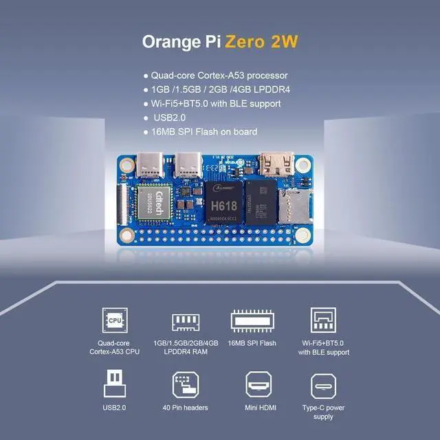 [Incredibly Powerful]: Orange Pi Zero 2W is a powered by Allwinner H618 quad-core Arm Cortex-A53 SBC with 1GB/1.5GB/2GB/4GB LPDDR4 RAM memory, embedding a larger 16MB SPI flash. And features Wi-Fi 5 and Bluetooth 5.0 connectivity.