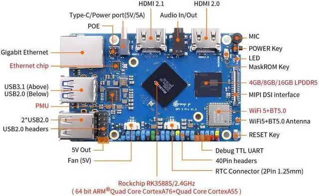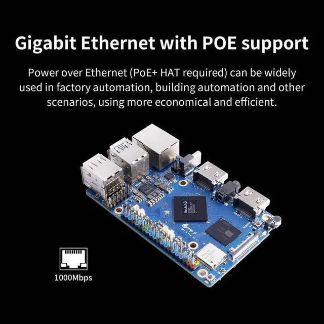 [WiFi/Bluetooth/Gigabit Ethernet]: Built-in 2.4G/5G dual-band Wi-Fi 5 and Bluetooth 5.0 with BLE support for stronger and more stable signals and easier and faster network transmission. Besides, Orange Pi 5 Pro supports Gigabit Ethernet with PoE, it can be widely used in factory automation, building automation and other scenarios.