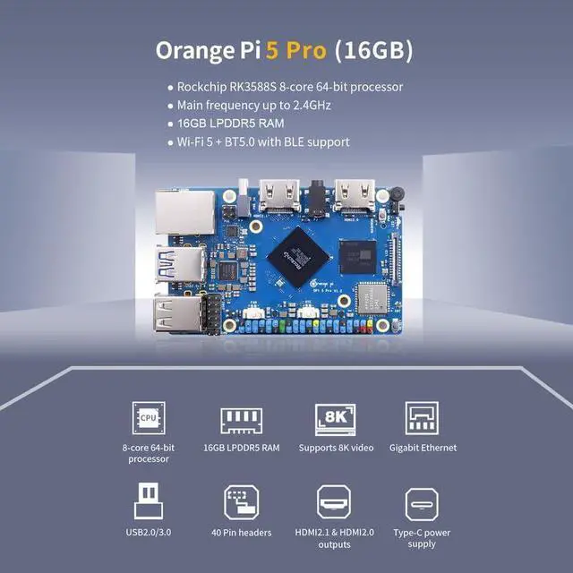 [LPDDR5 Memory Standard]: Orange Pi 5 Pro uses Rockchip RK3588S 8-Core(4-core A76 and 4-core A55) 64-Bit processor. With 4GB/8GB/16GB LPDDR5, Orange Pi 5 Pro can meet the edge computing needs of most end devices. Up to 2.4GHz main frequency and 8K display processing, it also supports WiFi 5, Bluetooth 5.0 and eMMC module.