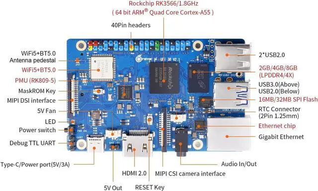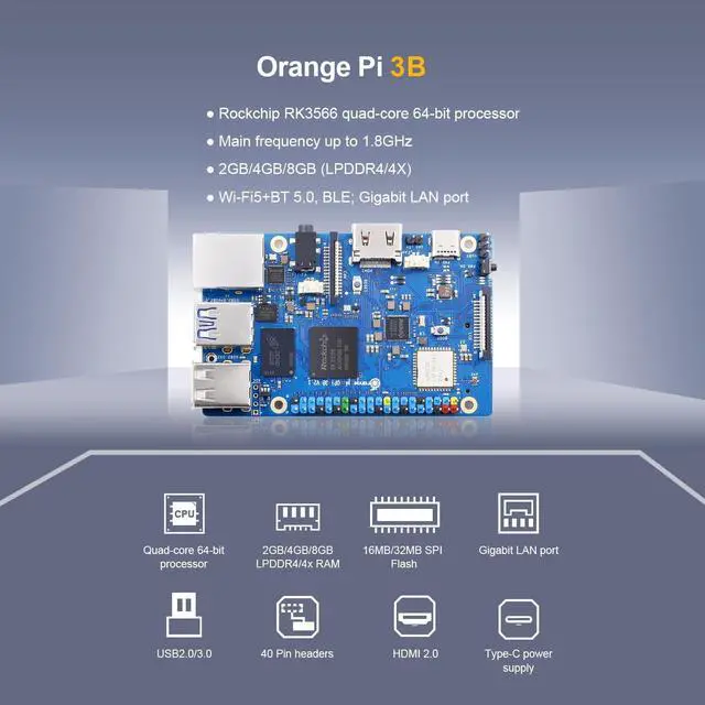 [High Performance]: Orange Pi 3B boasts a powerful Rockchip RK3566 quad-core 64-bit processor. It offers 2GB/4GB/8GB of high-performance memory and operates at a maximum frequency of 1.8GHz. Orange Pi 3B supports eMMC modules 32GB/64GB/256GB providing flexible storage options and features Wi-Fi 5 and Bluetooth 5.0 connectivity.