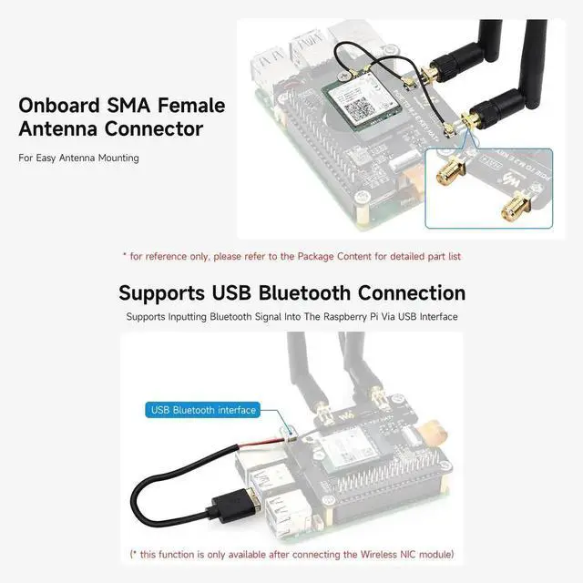 Supports inputting Bluetooth signal into the Raspberry Pi via USB interface (* this function is only available after connecting the Wireless NIC module)