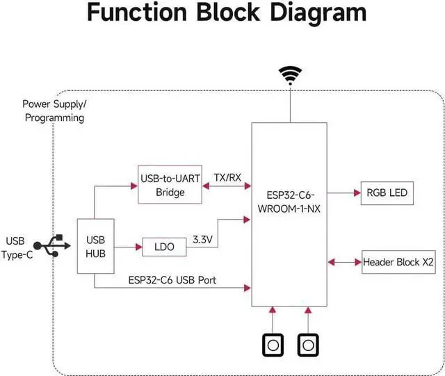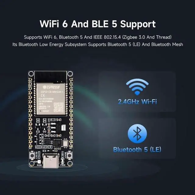 Adopts ESP32-C6-WROOM-1-N8 module with RISC-V 32-bit single-core processor, up to 160MHz main frequency, built-in 8MB Flash
