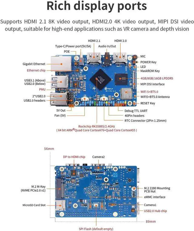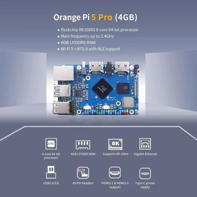 Orange Pi 5 Pro 4GB LPDDR5 8 Core 64 Bit RK3588S Single Board Computer, 8K Video Decoding 2.4GH z Frequency WiFi Bluetooth Open Source Board Run Orange Pi OS, Android, Debian, Ubuntu