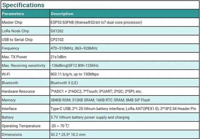 MCU: ESP32-S3, LoRa Chip: SX1262, USB Socket: Type-C