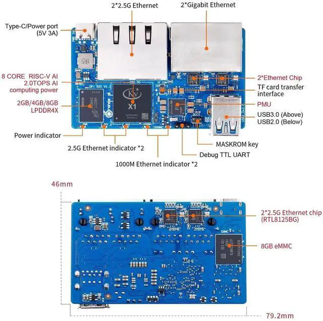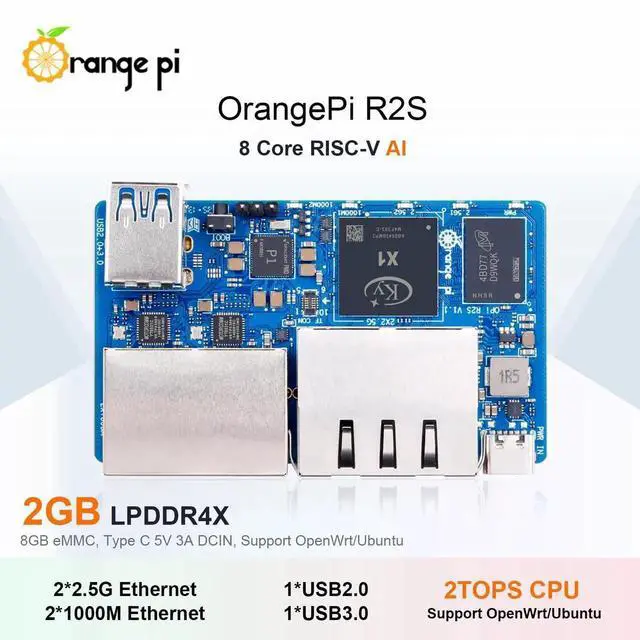 High Performance RISC V AI - Orange Pi R2S 2GB is powered by Ky X1 8-core RISC-V AI CPU, providing 2TOPS CPU fusion of general-purpose arithmetic power. It has 2GB/4GB/8GB LPDDR4X operating memory, and supports 8GB eMMC .