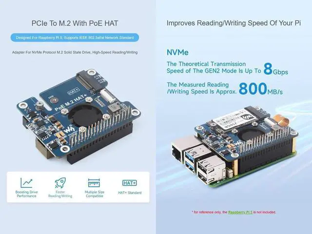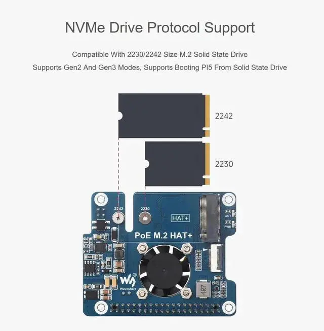 POE M. 2 HAT+ is an expansion board that combines Power over Ethernet (PoE) and PCIe to M. 2 functions for Raspberry Pi 5, supporting the IEEE 802.3 af/at network standard. It also supports M. 2 NVME hard drives of 2230 and 2242 sizes, and SSD booting of Raspberry Pi.